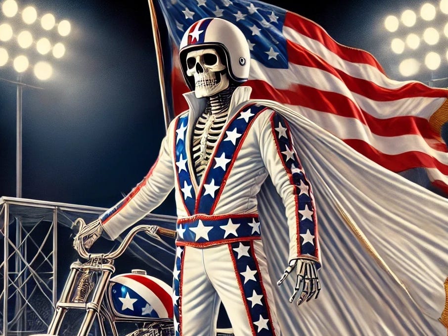 The red, white, and blue outfit was my idea—it was all about embodying the American spirit. I wanted to be a modern-day cowboy, like you said, but instead of riding a horse, I was riding a motorcycle. The jumpsuit wasn’t just about style; it was about creating a persona that was larger than life. The cape, the stars, the stripes—it was all designed to make me look like a superhero, an all-American daredevil who could do the impossible.